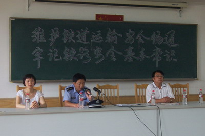首先由上海南站派出所的沈宏良副所长向学生们介绍了铁路安全的重要意义。他指出,经过六次大提速,旅客列车的运行时速可达160至200公里以上,京沪线的部分区段能达到时速250公里,伴随着高速客运专线的建成,时速达350公里的高速列车也将在祖国大地上飞驰。所以,确保列车的行驶安全是非常重要的。他告诫同学们,千万不要越墙进入线路,更不要在铁路上嬉戏、用石头击打列车或在铁路上设置障碍物,以免造成不必要的损失和伤害。