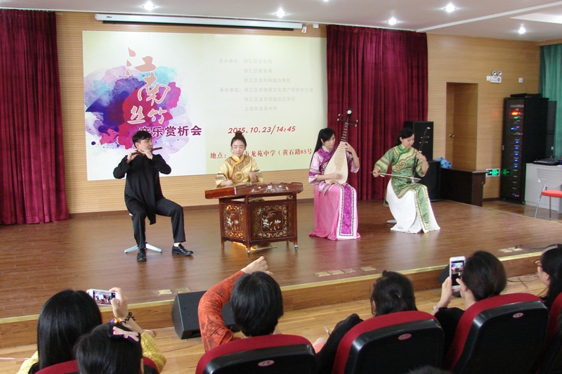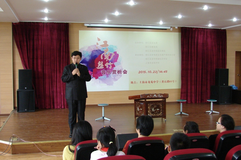 黄华层层携竹露,金钟曼曼送丝风。10月23日,在这个秋风送爽的日子里,上海唯一的职业民族室内乐团——上海馨忆民族室内乐团在龙苑中学演奏“三六”、“春江花月夜”、“云庆”等江南丝竹代表曲目,为龙苑中学的师生打开了一扇江南丝竹的大门。此次赏析会是千年龙华民俗大讲坛的活动之一,由徐汇区文化局、徐汇区龙华街道办事处主办,由徐汇区非物质文化遗产保护办公室,龙华社区文化活动中心以及我校承办。对于对传统音乐比较陌生的中学生们来说,这是一次难得的弘扬非遗领略传统文化的独特魅力、亲近“非遗”的机会。