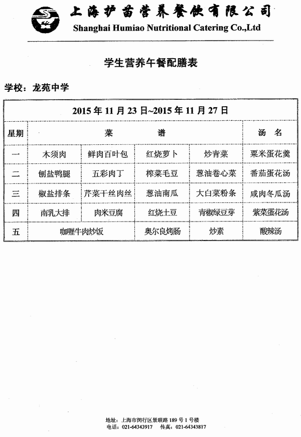 2015年11月23日~11月27日学生营养午餐配膳表