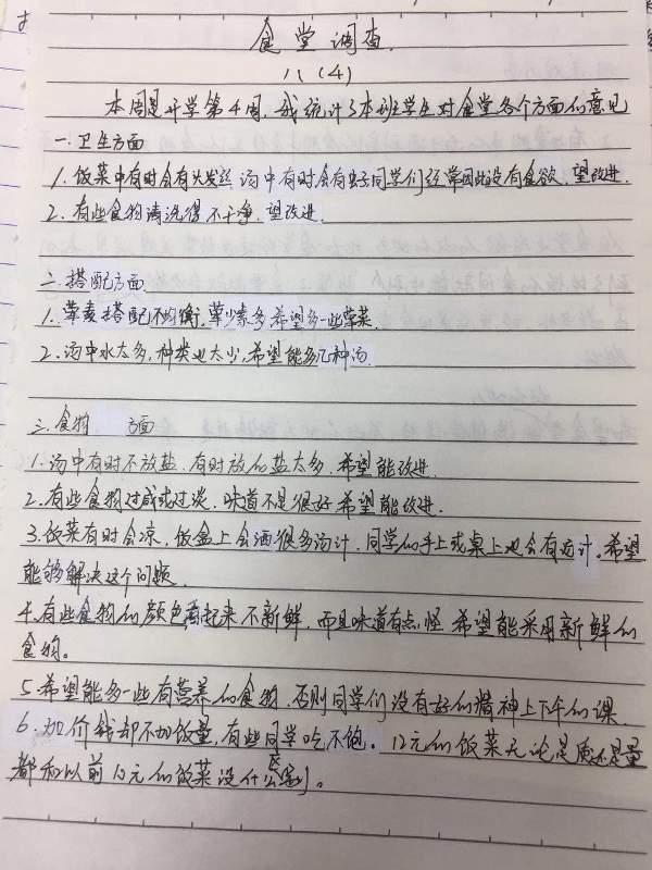 队员汤晨燕表示南瓜有时候会被饭盒压扁或稀烂,就没有吃的食欲了,汤的问题还是很大,味道有些淡,汤的量不足。 队员梁欣月认为油炸食品过多,希望荤菜多一些健康的,还有油炸荤菜面太多。队员秦露露认为荤菜太干,有时候都咬不动。还有一些队员表示个别班级学生在饭菜中吃出了头发、虫子等异物。米饭的量还是不足,尤其是吃土豆牛肉饭时,学生都吃的很多,希望增加量。饭菜可口程度还是需要提高,食堂收碗筷时间太快。