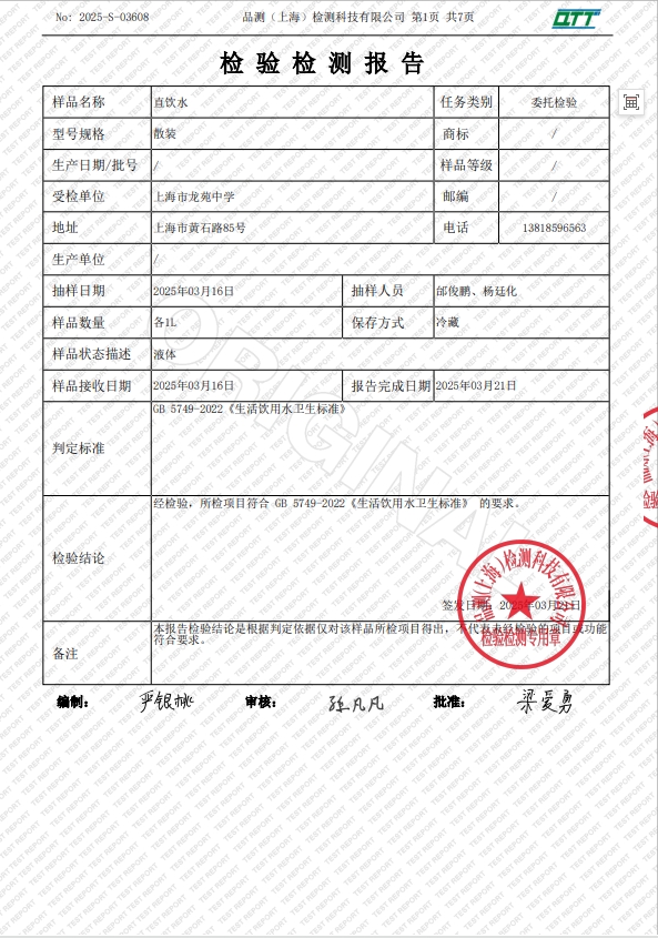 龙苑中学2025年3月直饮水质量检验报告