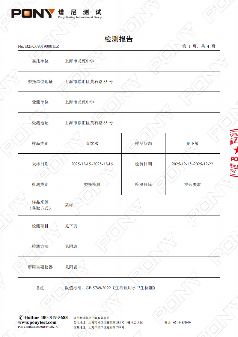 龙苑中学2025年12月直饮水质量检验报告