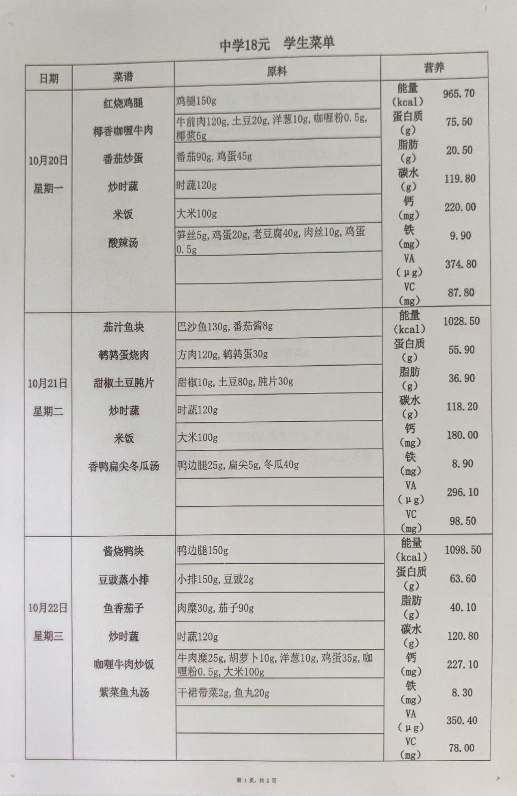 龙苑中学 2025年10月20日~2025年10月24日 AB餐