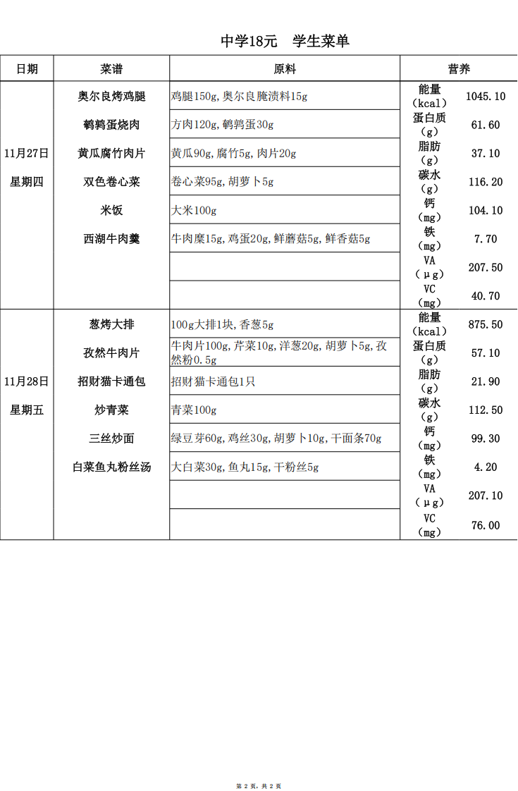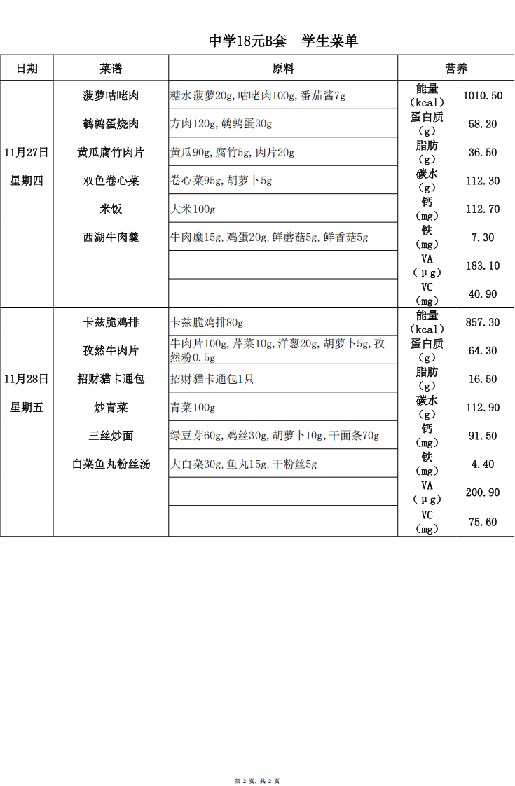 龙苑中学 2025年11月24日~2025年11月28日 AB餐
