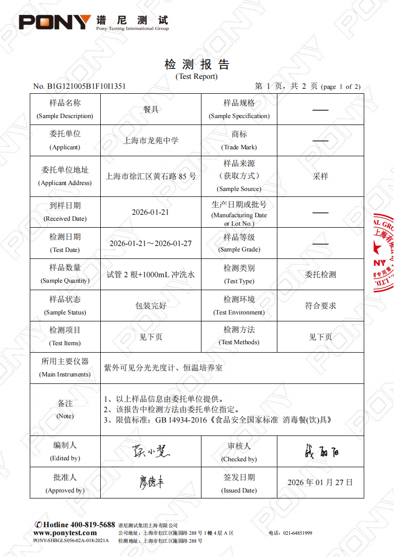 海市龙苑中学1月餐具检测报告
