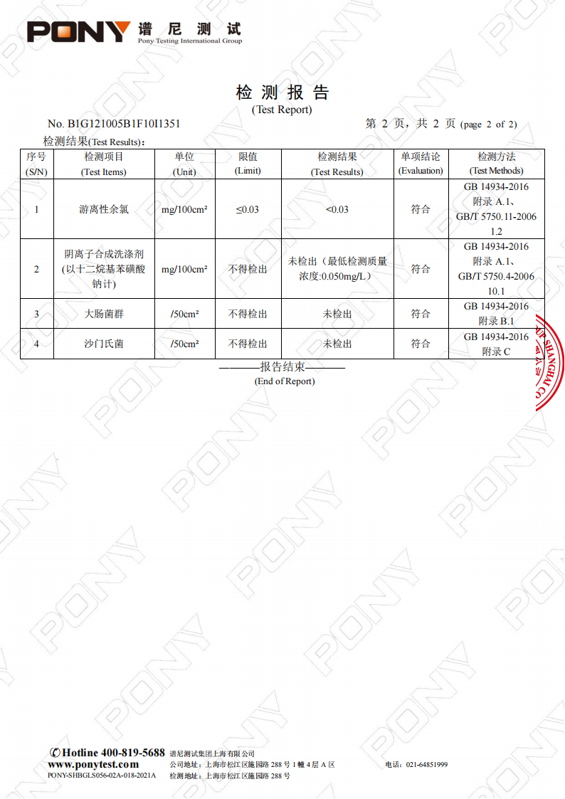 上海市龙苑中学10月餐具检测报告